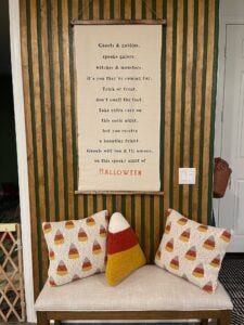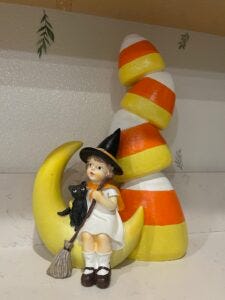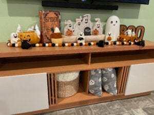 In the past, we’ve done a more spooky set up…witches, Ouija boards, and skeletons. But since starting our family, I’ve decided to do a more cute and fun Halloween display.