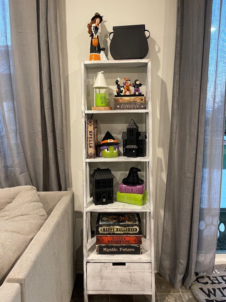 In the dining room, I have this ladder shelf that I decorate for every holiday! For Halloween, I went with this cute witch theme. Most things I got from Home Goods.