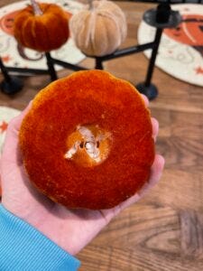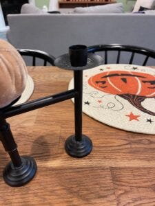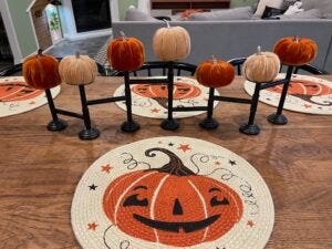 Also in the dining room is our table. I put out these cute pumpkin place mats and DIY-ed a little centerpiece with candle sticks and mini pumpkins. I just cut a hole on the bottom of the pumpkin and the candle stick fit right inside!