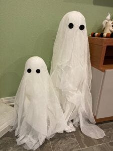 In our living room, I went with this friendly ghost theme. Again, most things came from Home Goods. The standing ghosts were an Aldi find...and they light up!