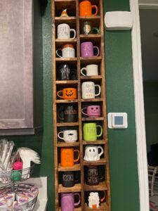 Lastly, the newest addition to our house is our DIY mug cubbies! We loved building these and filling in all our Halloween mugs!